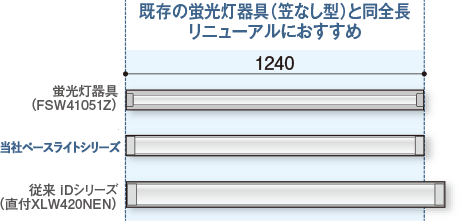 ※他社蛍光灯器具(2019年3月末生産終了品)と40形 直付型 W230 一般タイプ 5200lmタイプ の比較